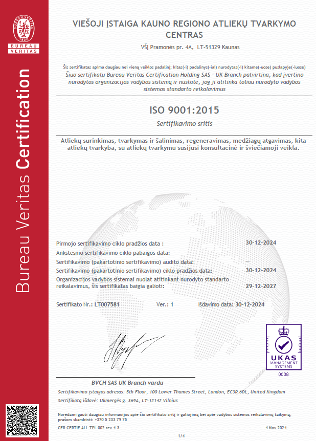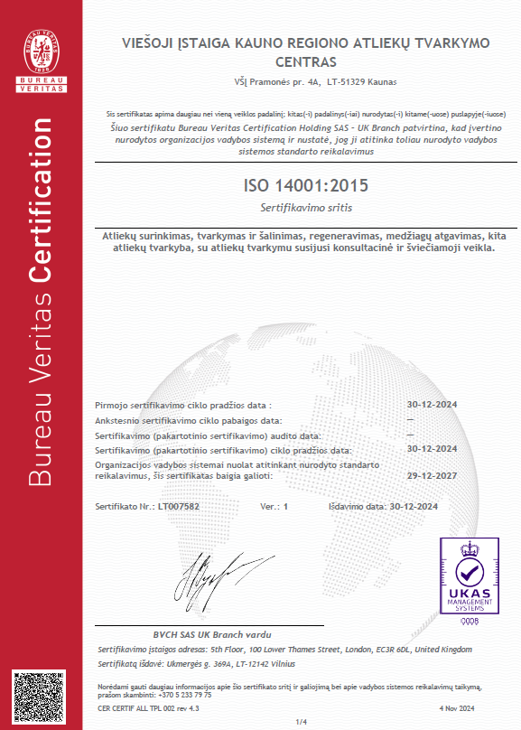 Norime pasidžiaugti, kad praėjusių metų pabaiga Kauno regiono atliekų tvarkymo centrui buvo itin reikšminga. 2024 m. gruodžio 30 d. įstaiga oficialiai gavo du tarptautinius ISO sertifikatus – ISO 14001:2015 aplinkosaugos vadybos ir ISO 9001:2015 kokybės vadybos standartus. Šis svarbus žingsnis žymi mūsų įsipareigojimą siekti aukščiausios kokybės, veiklos efektyvumo ir aplinkosaugos sprendimų užtikrinimo.